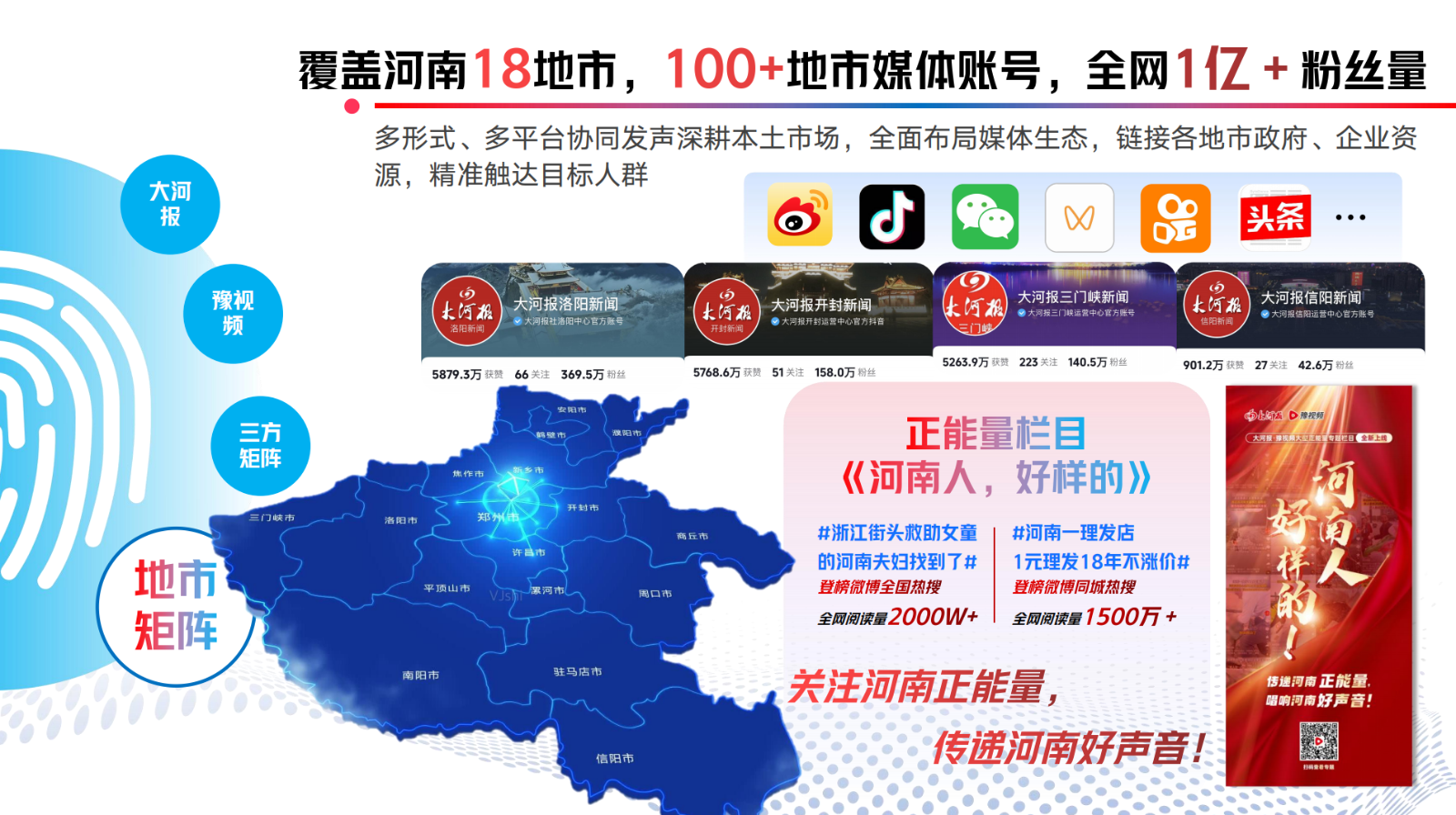 无论是抖音的流量爆点、视频号的私域沉淀,还是微博的全国造势,《大河报》三大平台均以 “本土基因” 为核心,为品牌提供差异化传播解决方案。从 “曝光” 到 “转化”,从 “本地” 到 “全国”,从 “短期流量” 到 “长期信任”,大河报能满足品牌不同阶段的传播需求,真正实现 “每一分预算都有回报”。
