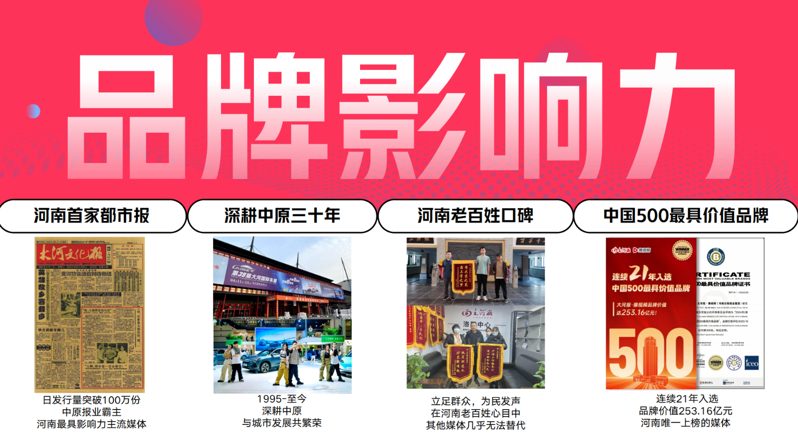作为深耕中原30年的主流媒体标杆,大河报凭借 “民生深度绑定+本土资源沉淀+全媒体覆盖” 的核心优势,已成为品牌打开河南消费市场、实现品效双升的首选合作平台。无论是快消、文旅、金融,还是教育、康养、汽车等领域,大河报都能为品牌提供 “精准触达+深度转化+口碑沉淀”的全链路服务。