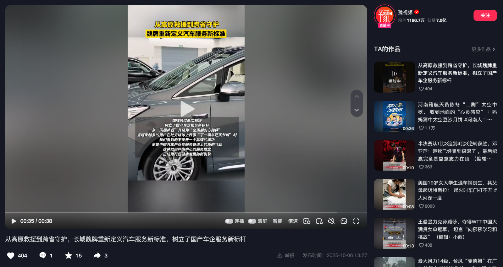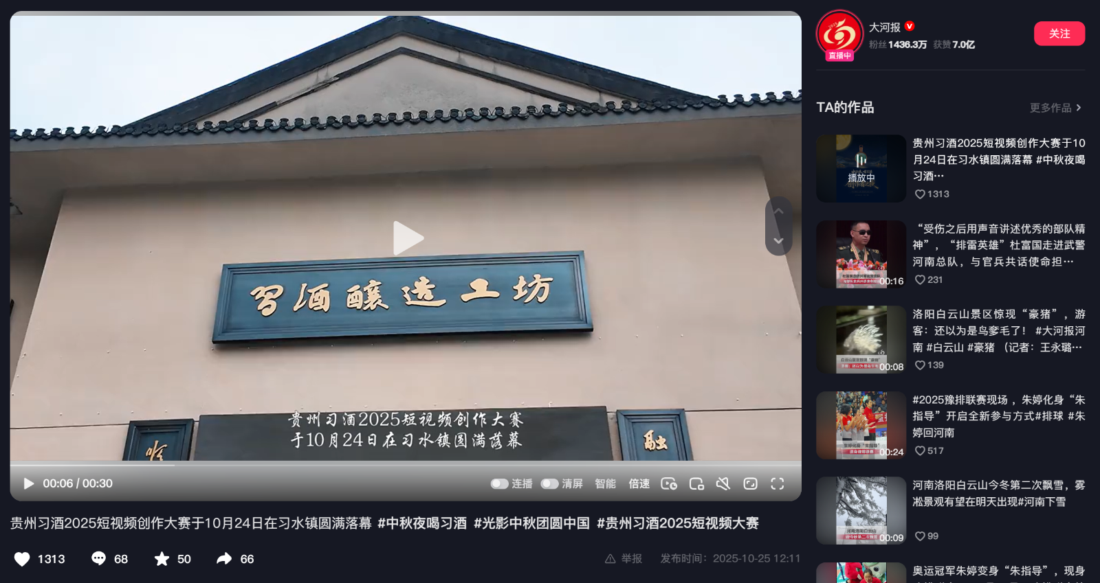 大河报(1436.3万)+豫视频(1196.4万)抖音号累计粉丝超2632.7万,用户以18-45岁本地人群为主,覆盖郑州、洛阳、南阳等18地市核心消费群体,大河报抖音累计点赞量7.03亿、豫视频抖音累计点赞量6.98亿,擅长用 “生活化场景+强情绪共鸣” 内容引爆传播,依托河南本土热点,为品牌定制“产品植入+话题”,快速抢占本地用户注意力。